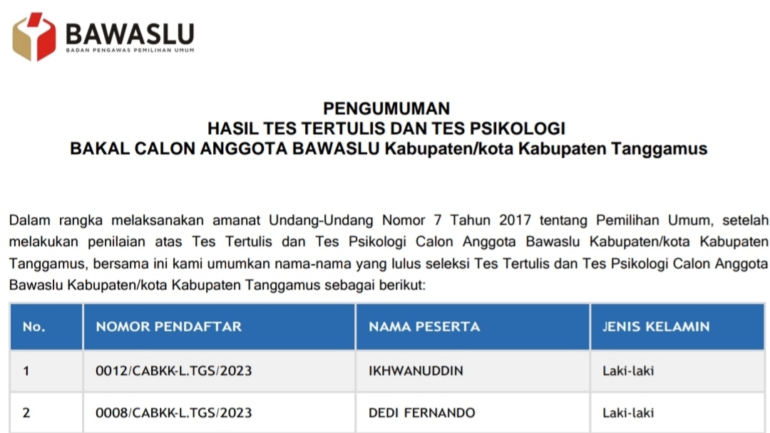 Tim seleksi calon anggota Bawaslu Kabupaten Tanggamus telah mengumumkan nama-nama peserta yang lolos dari seleksi tes tertulis dan psikologi, Jumat, 14 Juli 2023.
