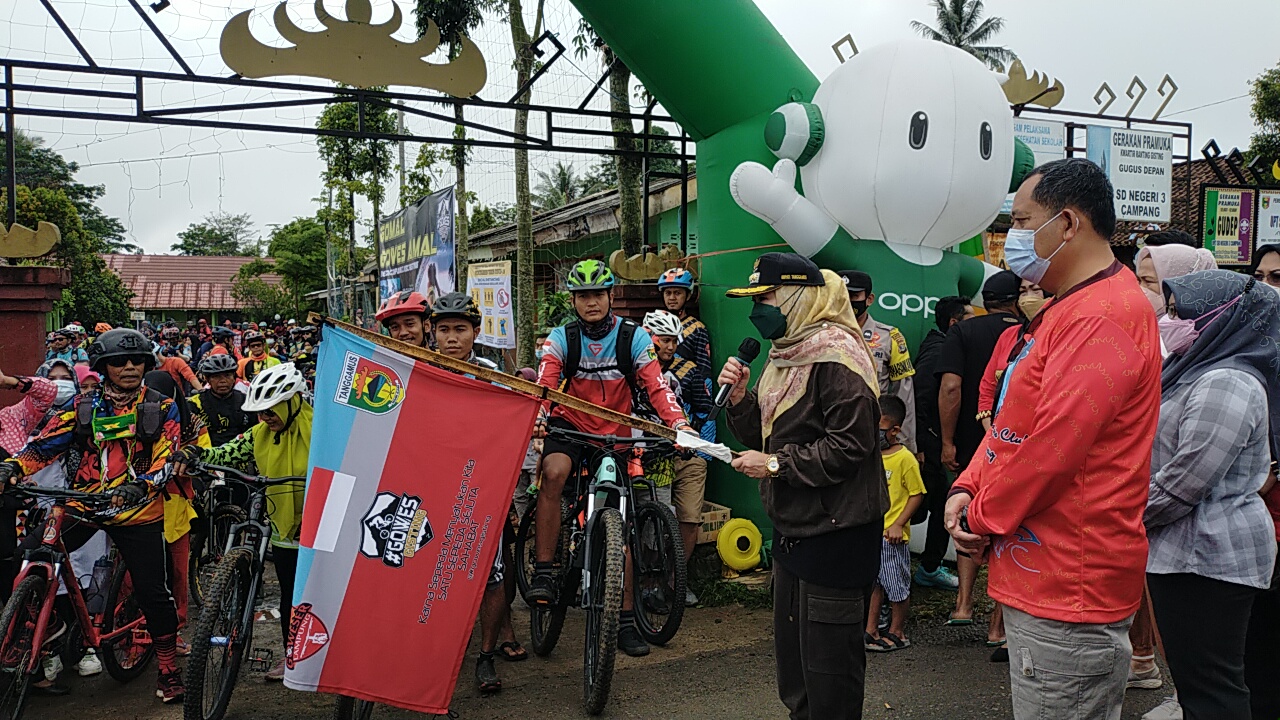 Lappung – Bupati Dewi Handajani dalam mengapresiasi kegiatan Gowes Amal (Gomal) untuk menggalang dana Pembangunan Masjid Nurul Iman, Pekon Campang, Gisting, Tanggamus, Minggu (05/12/2021).