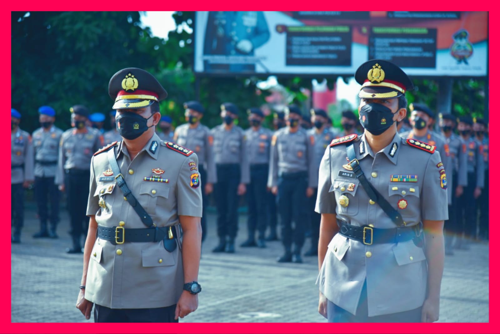 Kombes Pol Aris Supriyono dengan Kombes Pol Adhi Purboyo ketika mengikuti upcara serah terima jabatan Dirresnarkoba Polda Lampung pada 4 Januari 2021. Foto: Arsip Humas Polda Lampung.