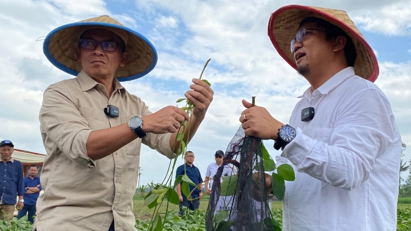 Para petinggi tersebut didampingi oleh Direktur dan SEVP PT Mitratani Dua Tujuh, yang bersama-sama menyaksikan proses panen edamame langsung di lahan.
